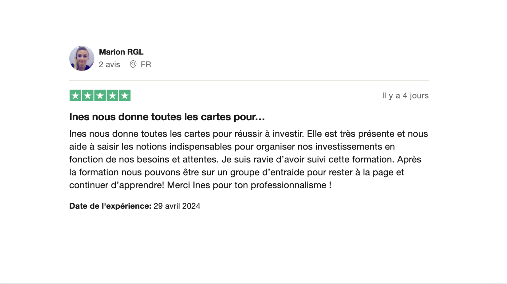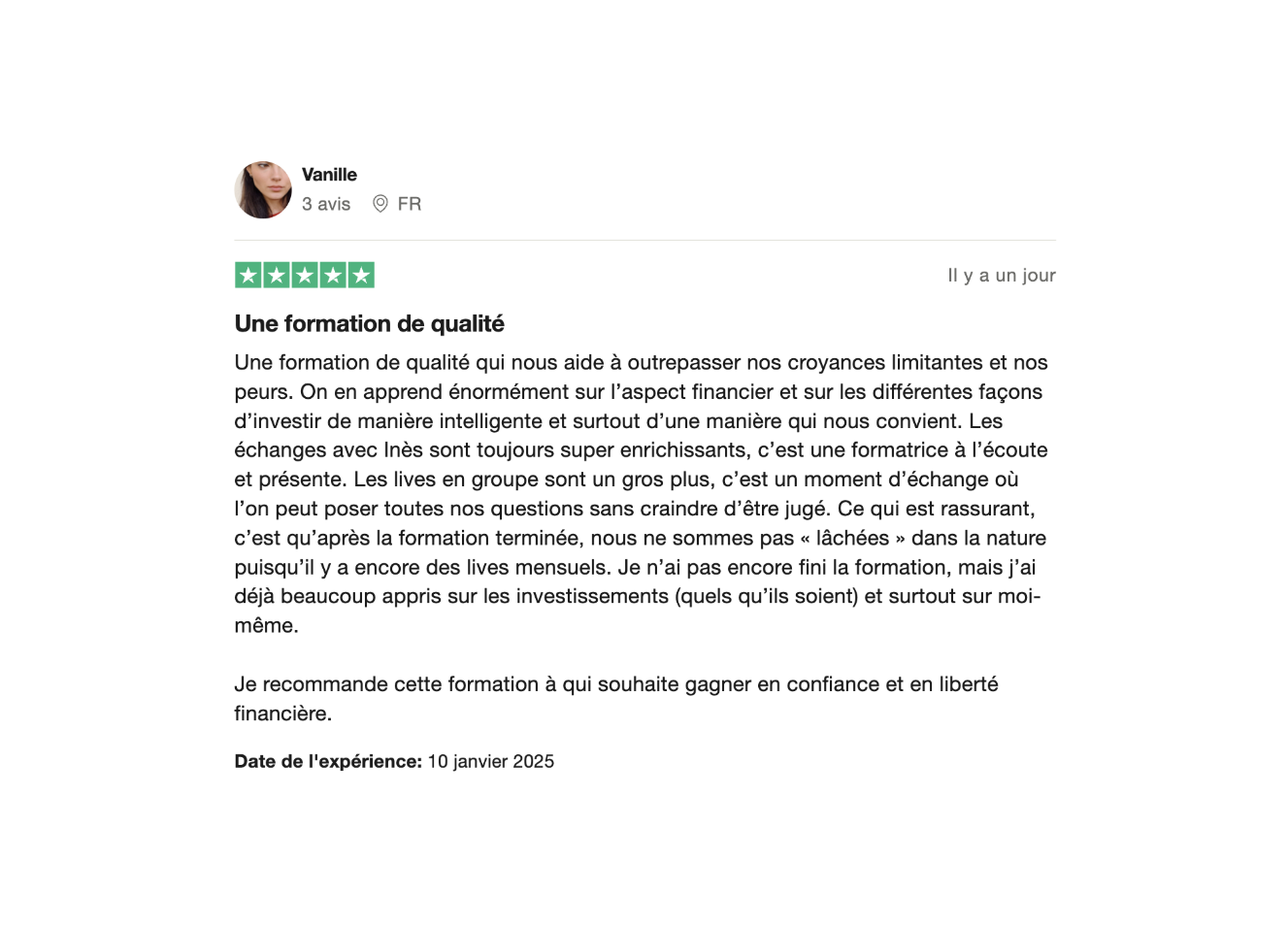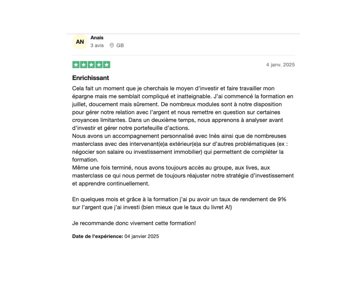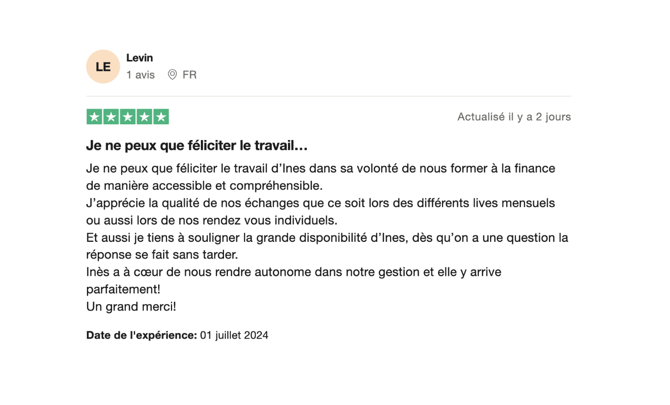 Je suis trÚs contente d'avoir suivi cette formation qui à répondu à mes attentes en terme de gestion de son budget, de connaissance sur les supports d'investissements. C'est une formation riche en informations. J'ai beaucoup apprécié les entretiens individuels et l'accompagnement à la mise en place de mon portefeuille. Mais aussi les lives dont InÚs prend le temps de répondre à nos questions et que l'information soit clair pour nous.