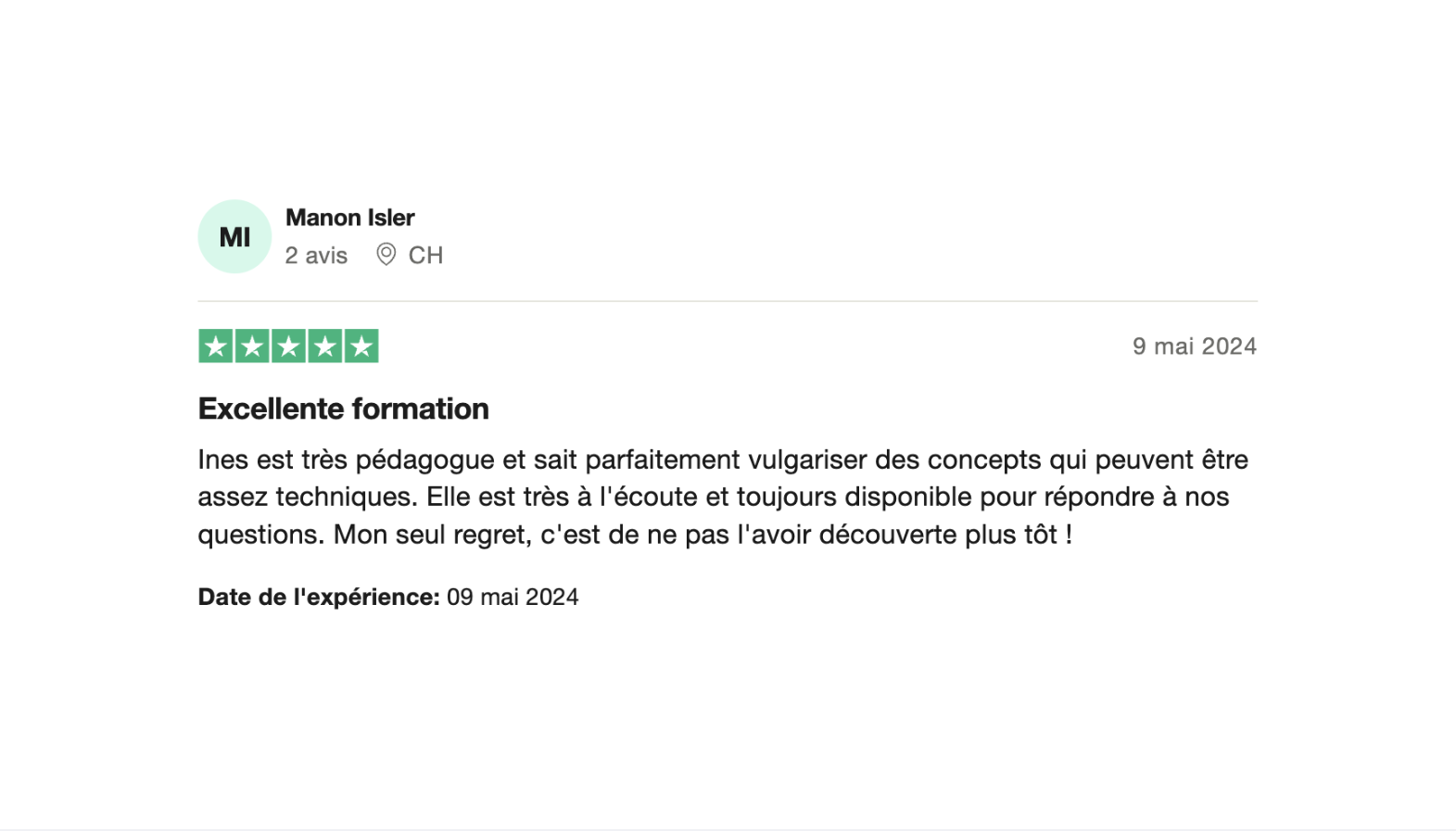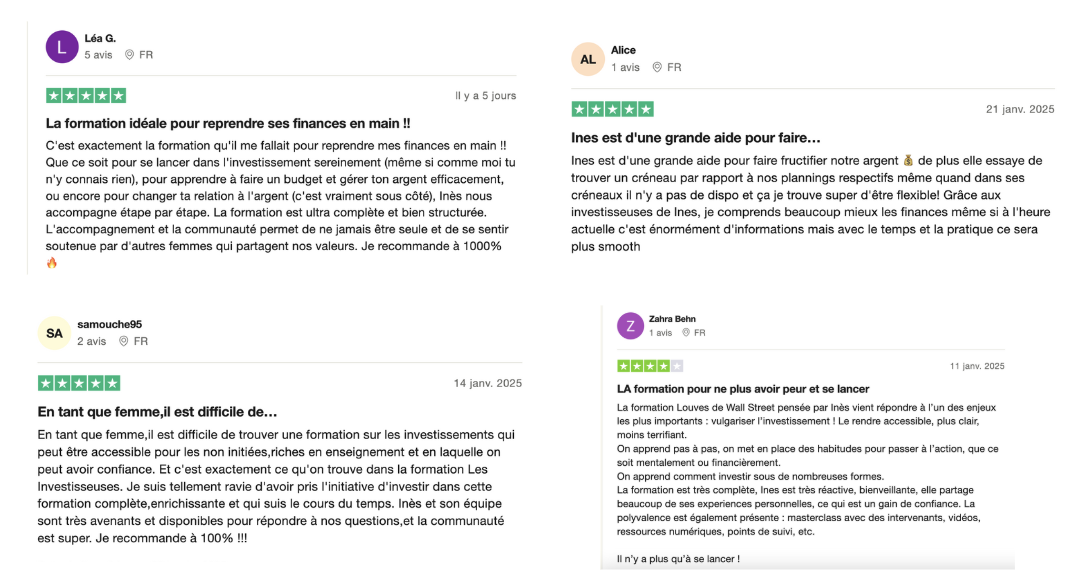 â J'ai rĂ©cemment suivi la formation "Louve de Wall Street" et jâen suis tres contente. Les concepts sont expliquĂ©s clairement, Ines est super accessible, et les coaching de groupe sont incroyable. Ines mâa aussi montrĂ© comment ne pas payer dâimpĂŽts sur ses investissements en Suisse une vrai mine dâor. Jâaime beaucoup les ateliers mensuels â Side hustle â ça mâa vraiment donnĂ© envie de lancer un business a cotĂ© de mon travail.